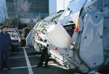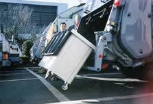 後部にSCBをチャッキング、傾倒する装置の付いたゴミ回収車。チャッキングしたSCBを回転させながら中のゴミを回収車に投入する。