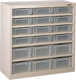 プラスチックコンテナを引き出しとしたラックです。軽量なプラスチックコンテナを引き出しにしておりますので、操作が軽くしかも丈夫です。部品管理ラックとしてご使用頂けます。