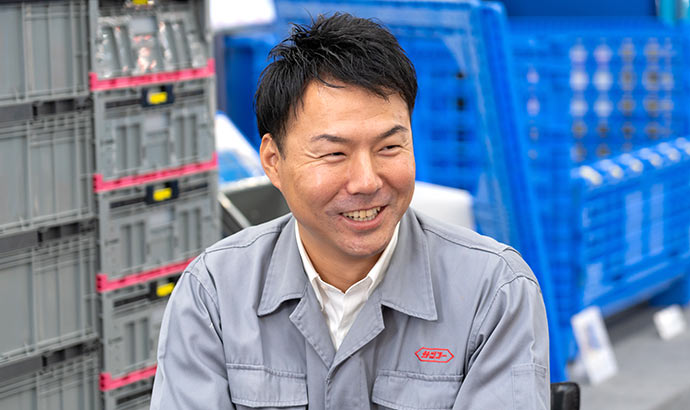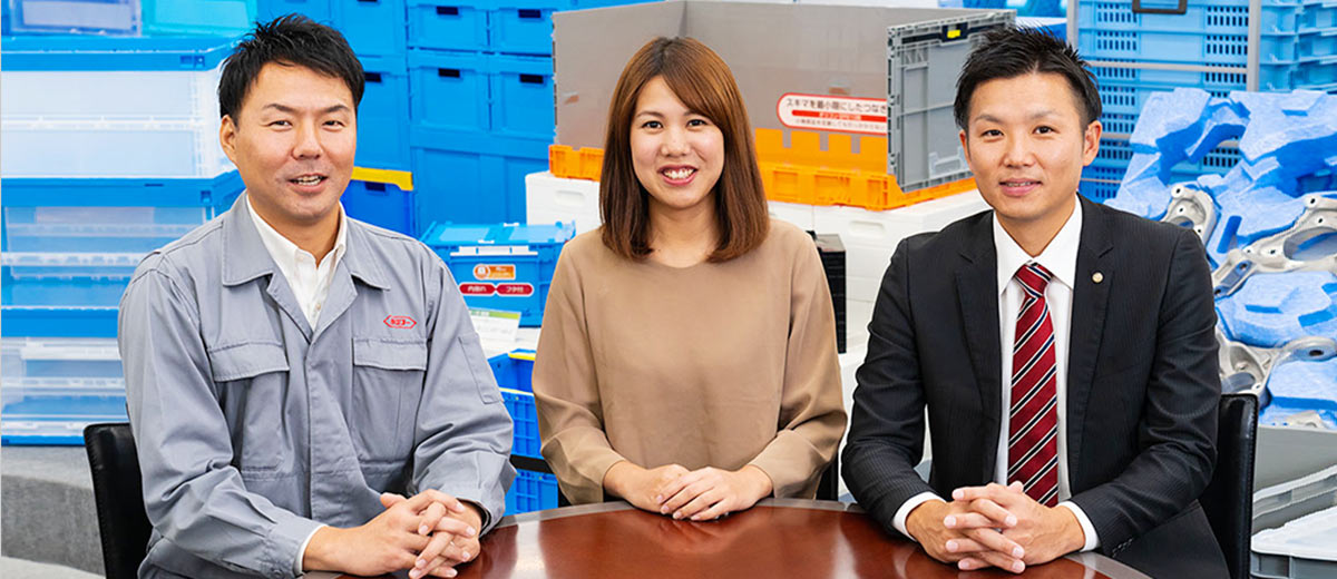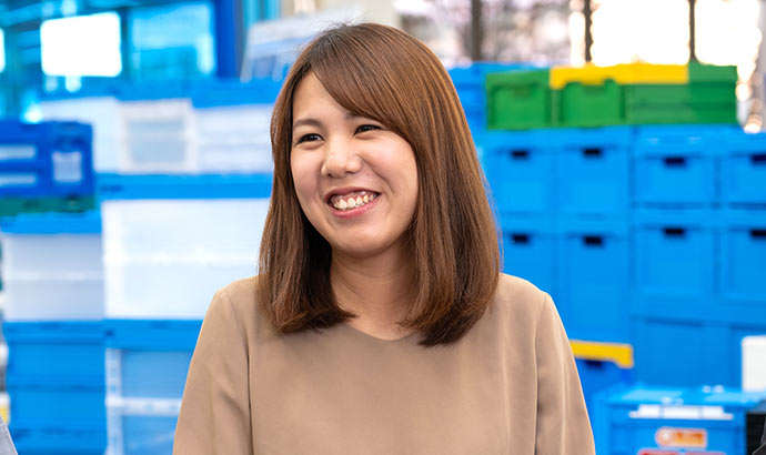 私は3年前に入社し、研修後ずっと商品設計部で同じ上司の下についています。プラスチックパレットやコンテナ等の定番製品はもちろん、ゴミ箱や湯桶などの生活雑貨まで様々なものの設計を手がけています。